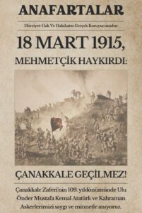 - “Bugün, tarihin altın sayfalarına kazınmış, milletimizin azim ve kararlılığının destanlaştığı gündür. Çanakkale Zaferi, yalnızca bir askeri başarı değil; aynı zamanda vatan sevgisinin, fedakârlığın ve inancın zaferidir.”
