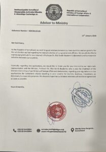 Somaliland Dışişleri ve Uluslararası İşbirliği Bakanlığı tarafından “Bakanlık Danışmanı” imzasıyla gönderilen resmi yazıda, Prof. Dr. Bilal Semih Bozdemir’den övgü dolu sözlerle bahsedildi.
