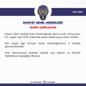 “Ankara Özel Harekat Şube Müdürlüğünde görevli polis memurumuz E.A. bugün saat 15.00 sıralarında beylik tabancasıyla intihar etmiştir. Elim olayla ilgili Emniyet Genel Müdürlüğümüzce 2 müfettiş görevlendirilmiştir. Polis memurumuza Allah’tan rahmet, acılı ailesine ve Emniyet Teşkilatımıza başsağlığı diliyoruz.”