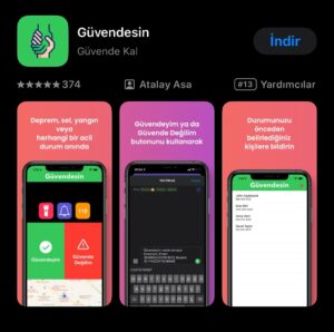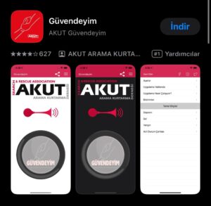 AKUT Arama Kurtarma Derneği ve Genel Bilgi Teknolojileri Ltd. Şti. tarafından geliştirilen “Güvendeyim” adlı mobil uygulama, deprem, sel, yangın ya da diğer acil durumlarda yakınlarınıza SMS yoluyla güvende olduğunuzu bildirmenizi sağlıyor. İnternet bağlantısı gerektirmeyen uygulamayı kullanabilmek için en az 1 kişinin telefon numarasının kaydedilmesi ve SMS hakkı izni olması gerekiyor. Ayrıca uygulamada acil durumlarda yetkililerin sizleri bulması için düdük sesi ve afetler hakkında yapmanız gerekenler için bilgiler yer alıyor.