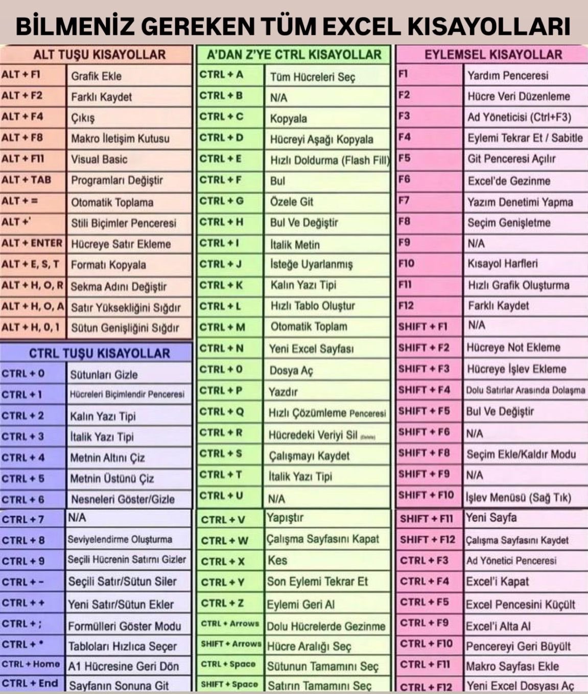 Ve daha fazlası! Paylaştığım görselde Excel’in en önemli kısayollarını bulabilirsiniz. Eğer Excel’de ustalaşmak istiyorsanız bu kısayolları öğrenmek şart!